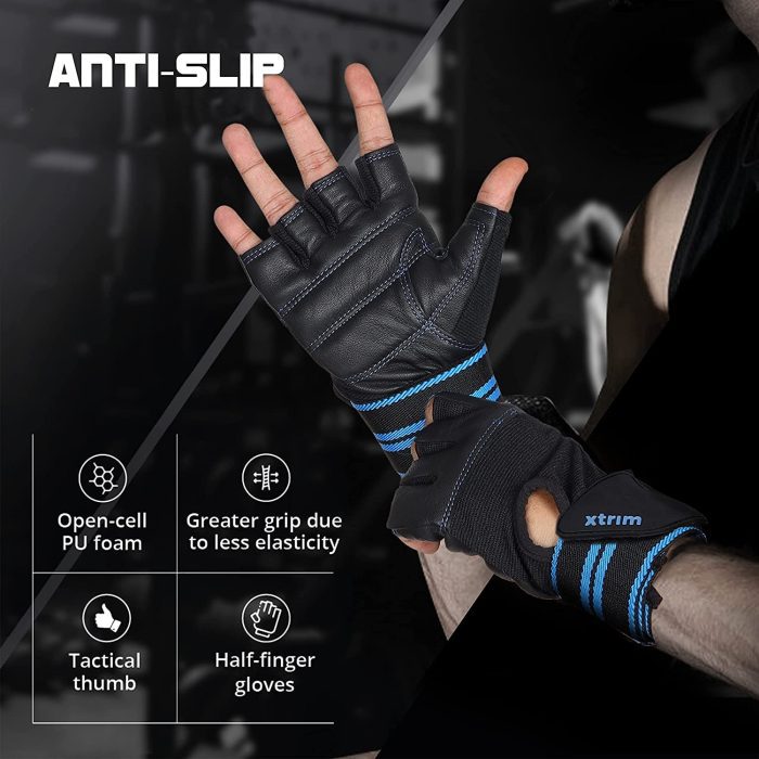 XTRIM Macho Unisex Leather Gym Gloves, for Professional Weightlifting, Fitness Training and Workout, with Half-Finger Length, Wrist Wrap for Protection and Tactical Thumb (Blue)