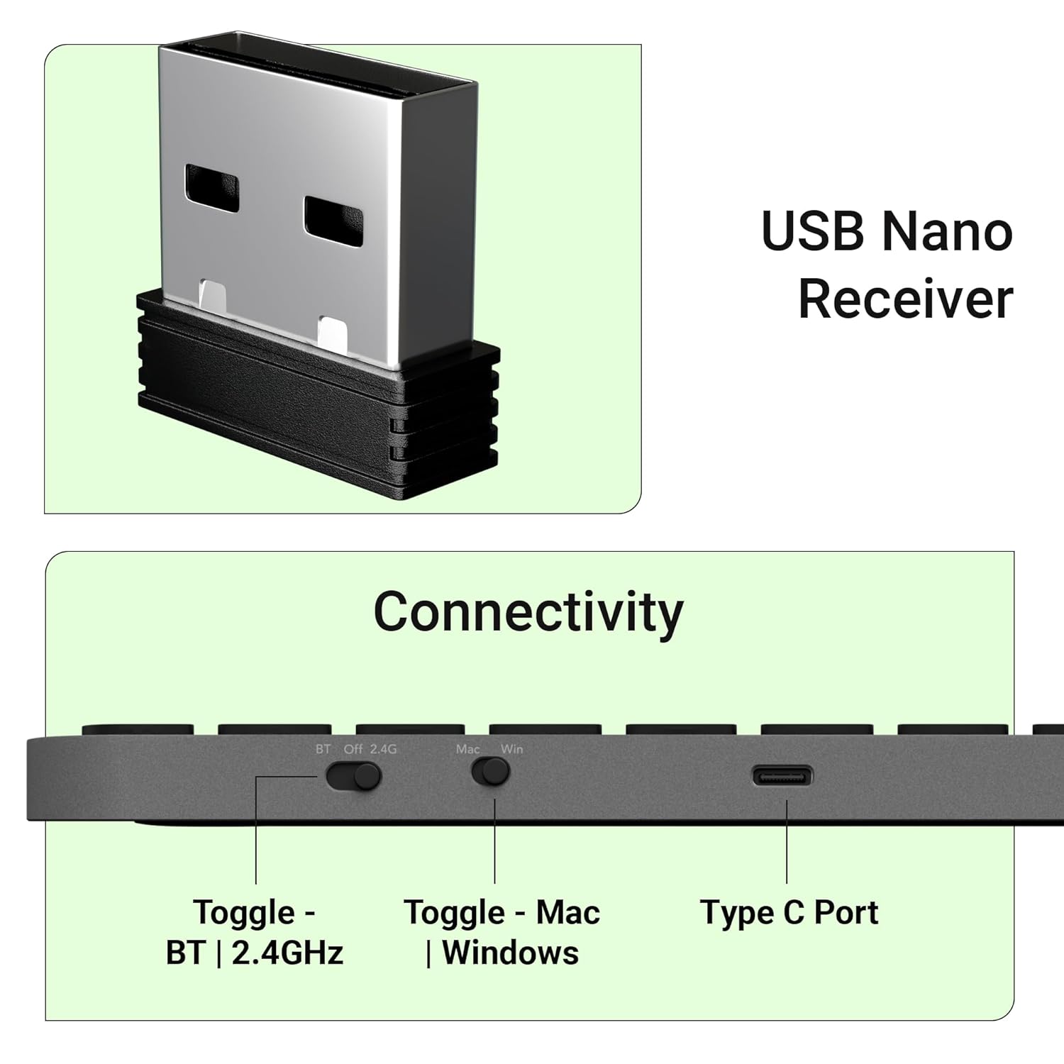 Toggle: For seamless switching between connectivity, the keyboard comes with a BT| 2.4GHz toggle switch that allows you to choose your preferred connectivity mode while the MAC|Win toggle allows you to switch between the MAC and Windows modes.