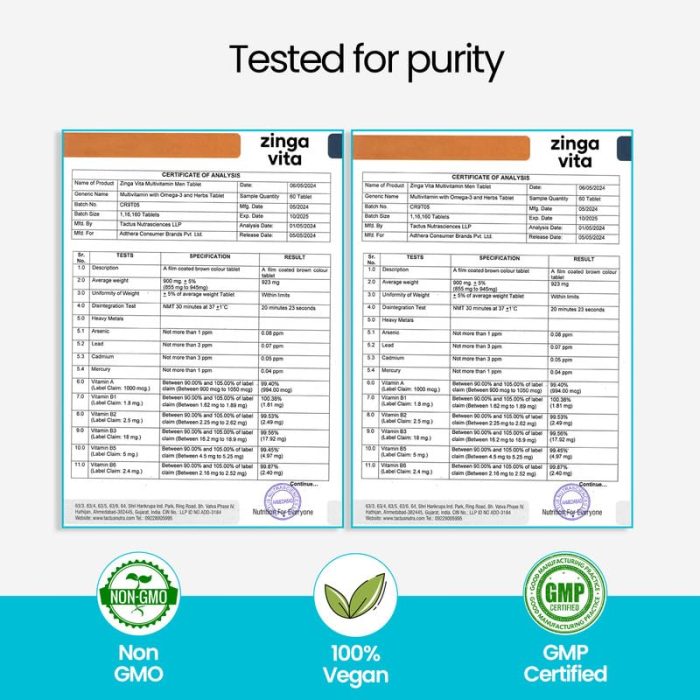 TESTED FOR PURITY: Zingavita is on a mission to bring healthy products which help make nutrition easy, accessible and extremely effective for your family so that you can pursue good health without compromise. Zingavita Multivitamins for men are manufactured in an FSSAI-approved, GMP & HACCP-certified facility. They are Non-GMO, gluten-free, and allergen-free with no added artificial preservatives and colors